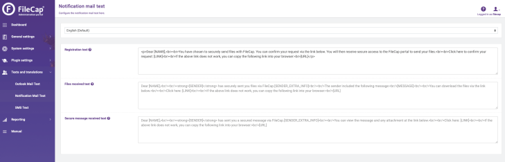 | Registration text | Specify the standard mail text to be used on file transfers sent via the FileCap Outlook Plugin |