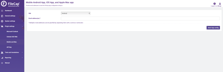 Specify the correct app (Android or Apple Mac/iOS) and enter the email address to send the FileCap App configuration string to.