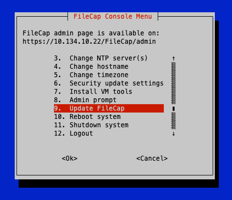 When logged in to the VM console either through the hypervisor or through SSH you will be presented with a menu that includes the option “Update FileCap”. This option, when selected, will immediately start the system update.